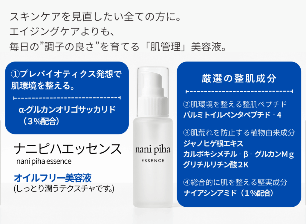nani piha essenceは敏感肌、ゆらぎ肌、肌荒れ、肌の不快感など、肌の不調を整え、長期的に安定した健やかな肌を育むための肌管理美容液です。